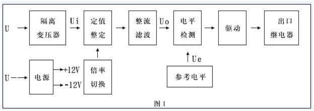 本繼電器為靜態(tài)型繼電器,采用進口集成電路構(gòu)成;被測量的交流電壓U~經(jīng)隔離變壓器降壓后得到與被測電壓成正比的電壓Ui,經(jīng)整定后進行整流,整流后脈沖電壓經(jīng)濾波器濾波,得到與Ui成正比的直流電壓Uo,在電平檢測中Uo與直流參考電壓Ue進行比較,若直流電壓Uo低于參考電壓,電平檢測器輸出正信號,驅(qū)動出口繼電器,則本繼電器處于動作狀態(tài)。反之,不論是過電壓繼電器或是低電壓繼電器,若直流電壓Uo高于參考Ue,電平檢測器輸出負信號,本繼電器處于不動作狀態(tài)。