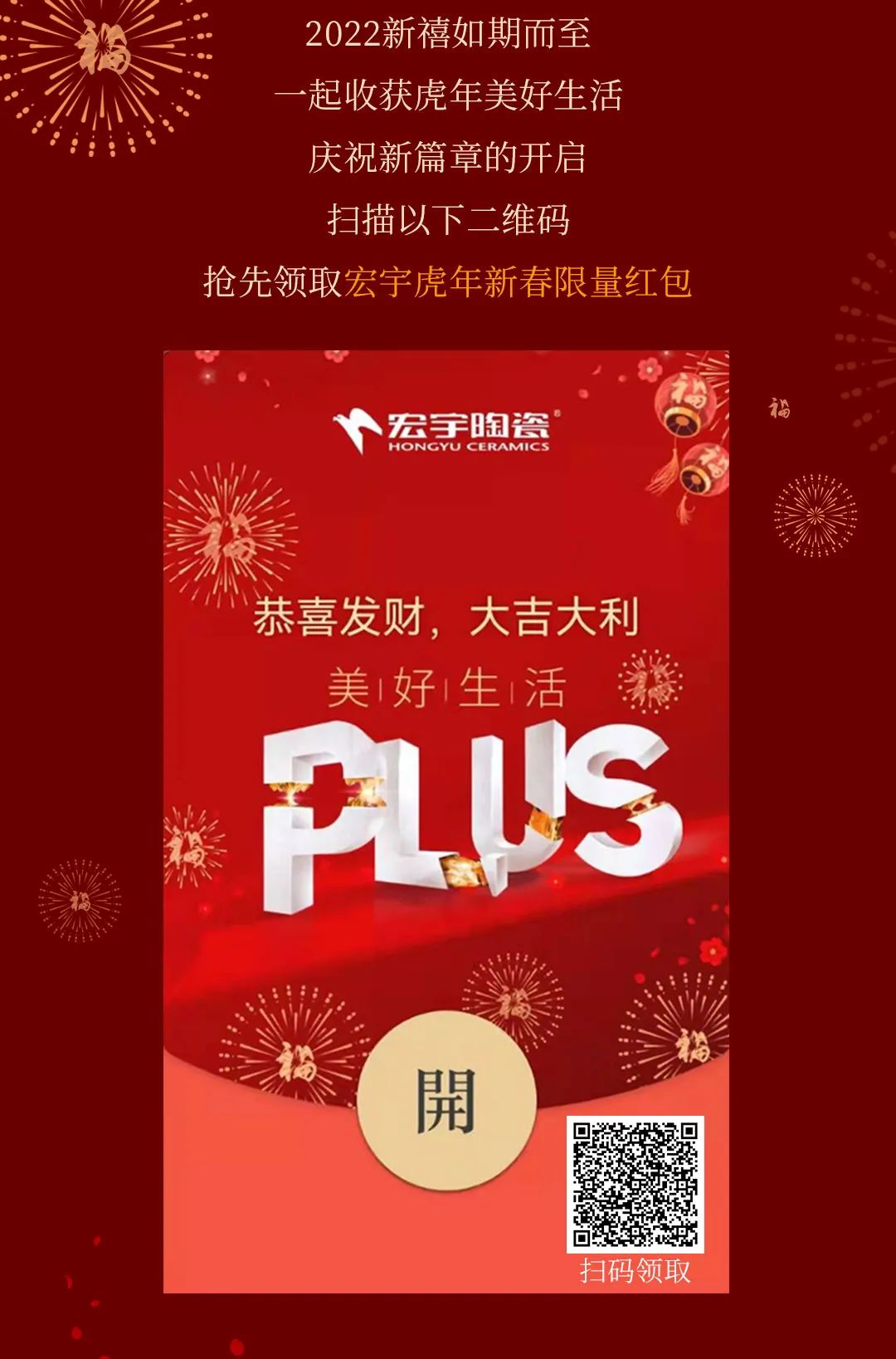2022宏宇虎年新春微信紅包封面來啦!宏宇祝您新年財運PLUS、幸福PLUS、健康PLUS!2022美好生活PLUS!