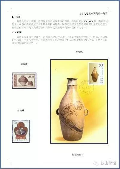 郵集共兩個(gè)章節(jié):第一章“陶器”包含彩陶、古代陶器精品和宜興紫砂陶三部分;第二章“瓷器”包含景德鎮(zhèn)瓷器、汝窯瓷器和鈞窯瓷器、磁州窯瓷器、唐山陶瓷和龍泉窯瓷器、德化窯瓷器和石灣陶瓷等六部分。