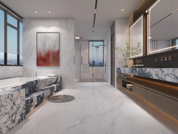 高顏值衛浴私密空間,配備雙臺盆+干濕分離淋浴+獨立浴缸,讓儀式感無處不在,大花紋奢石洗手臺盆和浴缸成為點綴浴室的藝術品,臺面下方設計柔光燈帶,勾勒奢華的衛浴空間,完美適配星級酒店以及現代人對品質生活的追求。