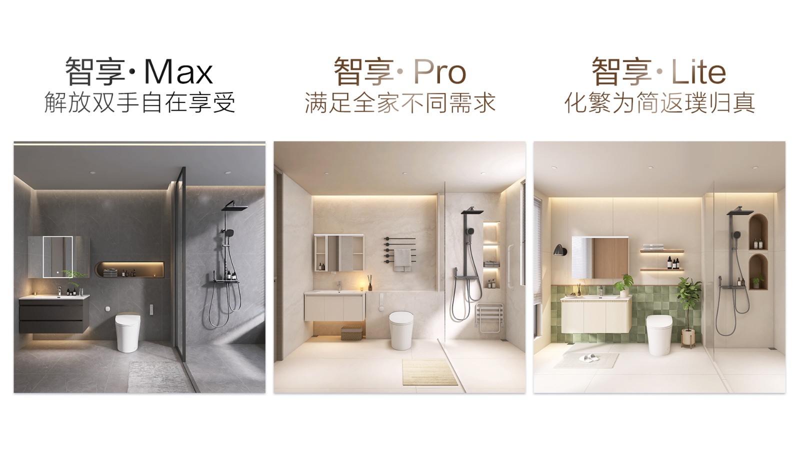 以套系化設計為核心,重磅推出三大「智」愈空間,以多樣產品組合匹配不同人群需求。套間內包含行業爆款舒沐洗H5Pro智能馬桶、口碑爆款H35Pro的升級力作——全新H36Max智能馬桶、以及HQ606輕智能馬桶,三大單品按需選購,更搭配了高顏值美妝智能鏡柜與鋼琴鍵花灑,實現功能與美學的雙重升級。